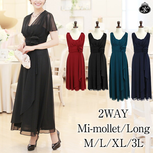 くるぶしまでのロング丈と膝が隠れる上品なミモレ丈の2種類から選べるほか、ドルマンスリーブとノースリーブの2WAYで楽しめて撮る外し可能なコサージュが2つ付いてくる優秀ドレスです♪